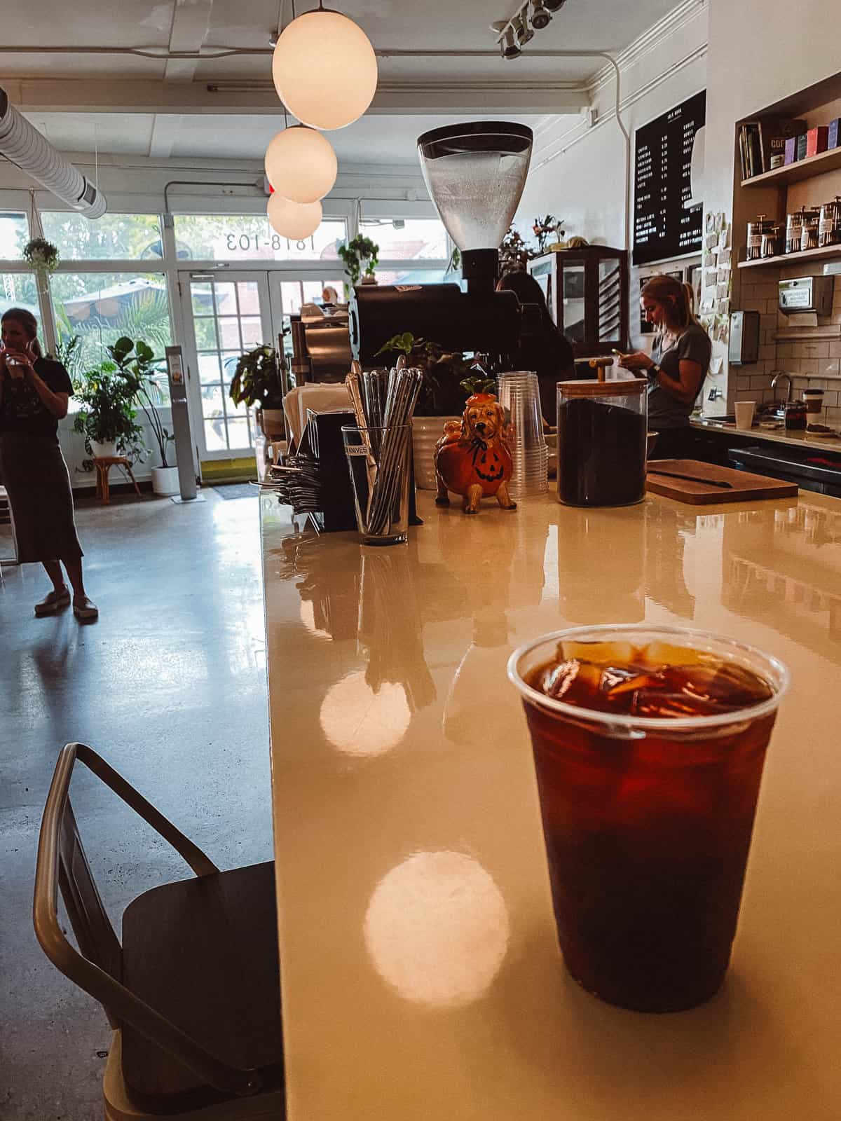 Since it is a little out of the way, the vibe is much more quiet and peaceful than other shops. The inside is bright with big windows and lots of natural light. This makes it a great place to work or to have some deep convo over a strong, smooth cup of coffee from local, small-batch roasters.