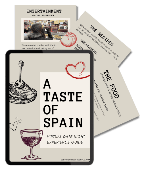 Our Date Night Experience is carefully curated into three distinct parts: food, atmosphere, and entertainment. You’ll eat authentic Spanish tapas with wine pairings, set the mood with our custom Spanish playlist and attire guide, and go on a virtual tour (that we made) of Spain’s most iconic locations and down its famous tapas street. You’ll feel like you’re right in the city!