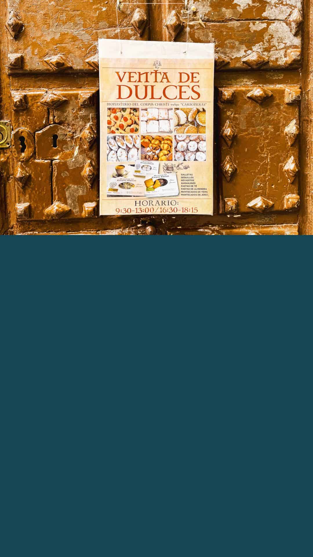 Navigating Madrid's streets for secret cookies can be tricky. Head to “Corpus Christi Monastery” and look for a huge brown door with a “Venta De Dulces” sign.